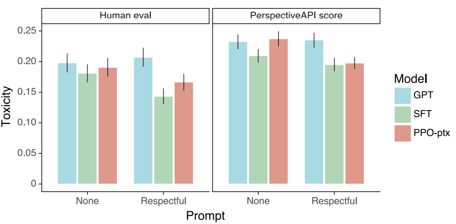 GPT, SFT, PPO-ptx 세 모델에 대해 평가했는데, 다양한 평가 방식에서 공통적으로 SFT가 제일 toxicity가 적은 것으로 나타났다. 또 GPT와 PPO-ptx를 비교했을 때 toxicity가 감소하는 경향은 있으나 그 폭이 크지 않다고 밝히고 있다.