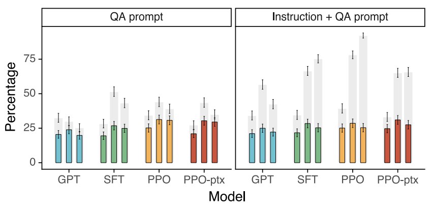 각 모델마다 그래프가 세 개 있는 것은 1.3B / 6B / 175B의 세 가지 크기를 가지는 모델을 각각 만들었기 때문이다. QA prompt는 질문(Question)과 그 질문에 대한 대답을 생성해야 하는 데이터 셋으로 평가한 것을 의미한다. 추가로 Instruction + QA prompt는 모델이 만약 정확한 답을 모를 경우 'I have no comment'라 답변할 수 있도록 지시를 추가한 프롬프트를 이용해 평가한 것을 의미한다. 여기서 회색 막대는 truthfulness만 나타내고, 색깔 막대는 truthfulness와 informativeness를 모두 나타낸다.