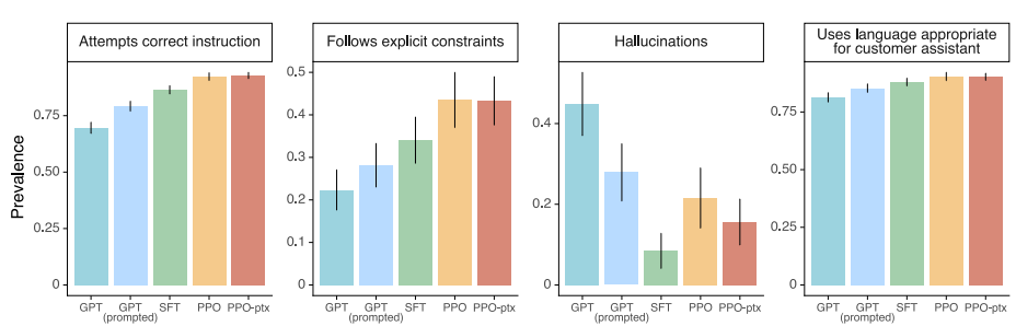 결과적으로 대부분의 평가 항목에서 PPO, PPO-ptx 모델이 다른 모델보다 더 많은 선호를 받았다. 다만 Hallucination의 경우에는 SFT가 PPO, PPO-ptx 모델보다 더 낮은 Hallucinations를 생성한다고 평가 받았다.